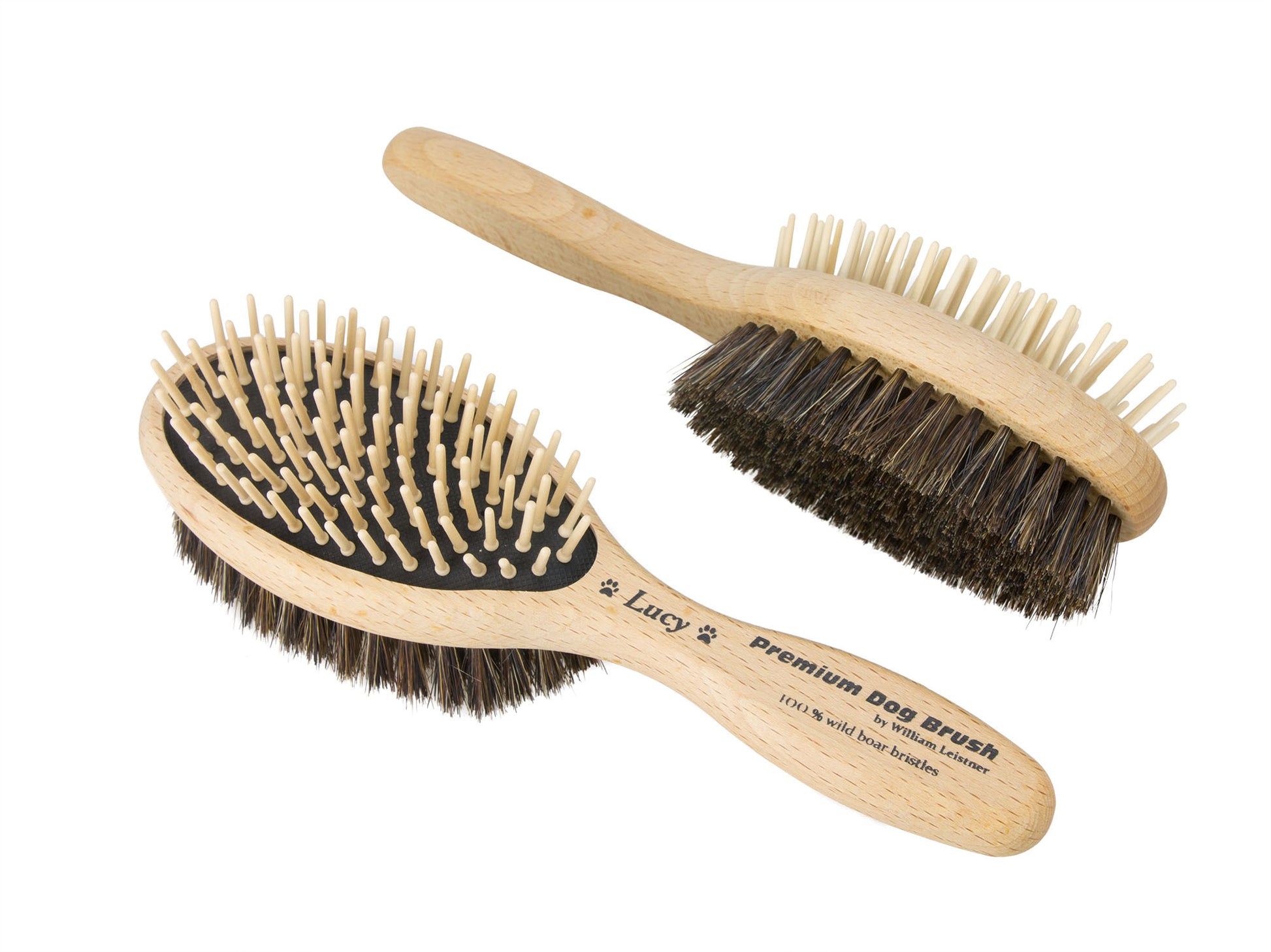 Die Premium Dog Brush Detangle Duo »Lucy« ist ein echter Alleskönner für Hundepflege! Die doppelseitige Bürste mit 100 % Wildschweinborsten und glatt polierten Buchenholzstiften (220 x 60 mm, medium-straff) macht’s möglich: